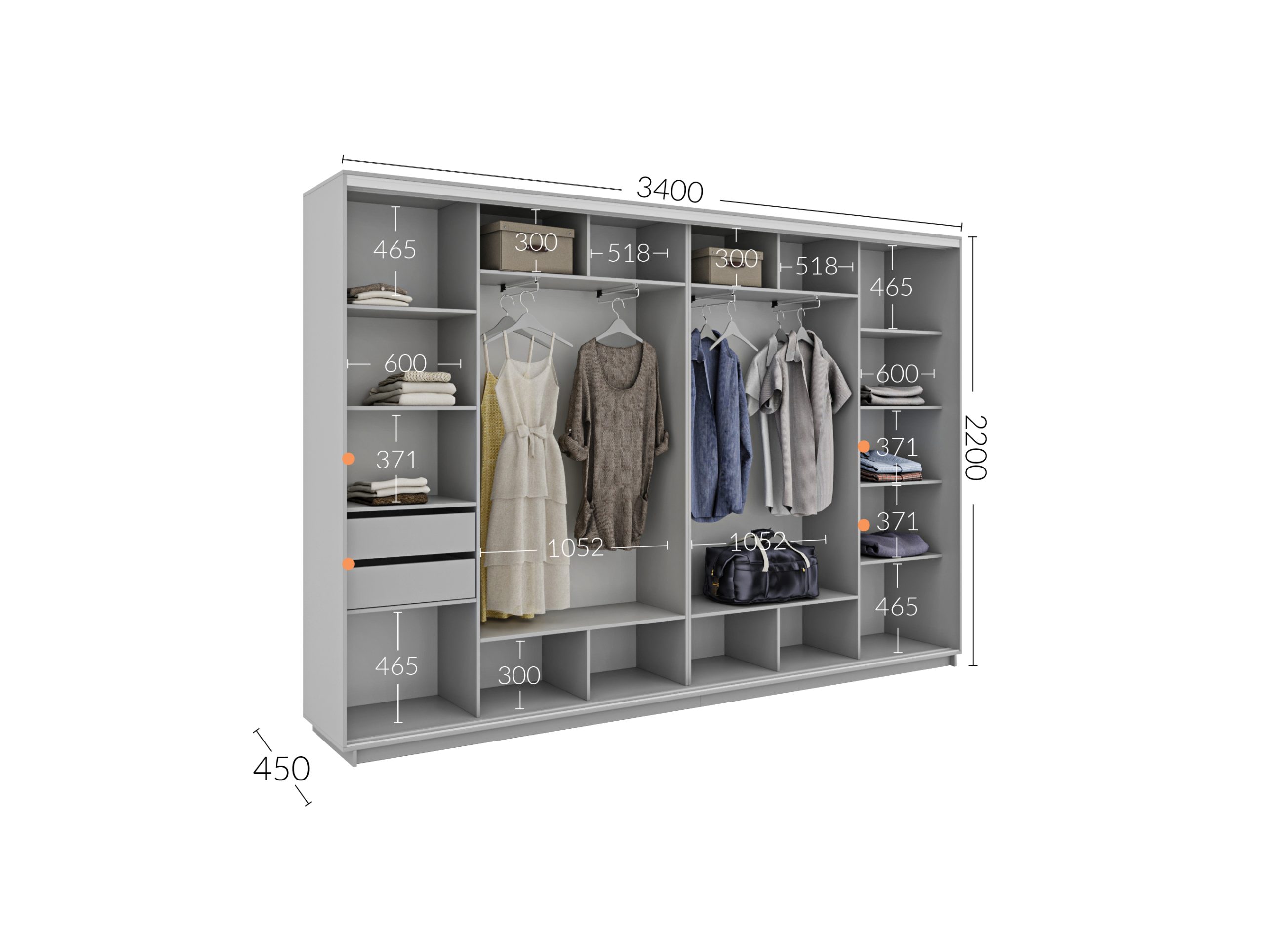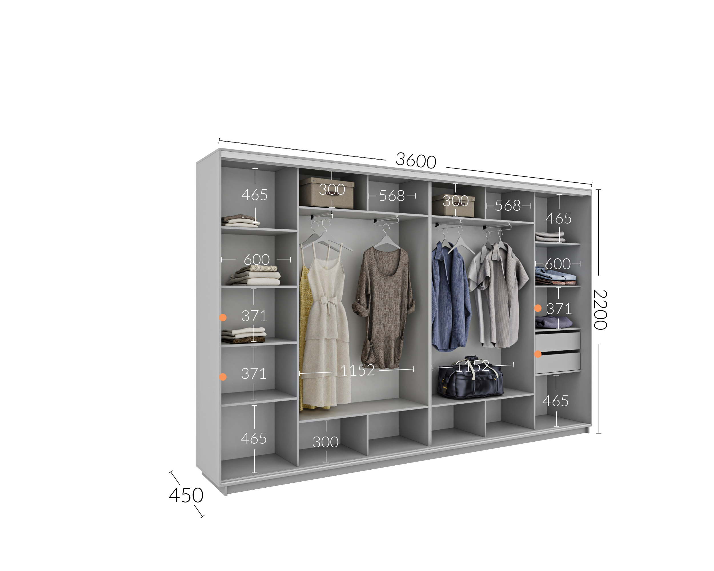 Чотиридверні шафи-купе на замовлення – це ідеальне рішення для тих, хто хоче оптимізувати простір та додати елегантності інтер’єру. Ширина шафи може бути змінена відповідно до ваших потреб, що дає можливість створити ідеальний варіант для будь-якого приміщення. Глибина шафи доступна в двох варіантах – 450 мм або 600 мм, що дозволяє вибрати оптимальне рішення залежно від ваших вимог до зберігання. Висота шафи складає 2200 мм, що забезпечує зручний доступ до всіх поличок та відділів. Це чудовий варіант для створення стильного та функціонального простору.