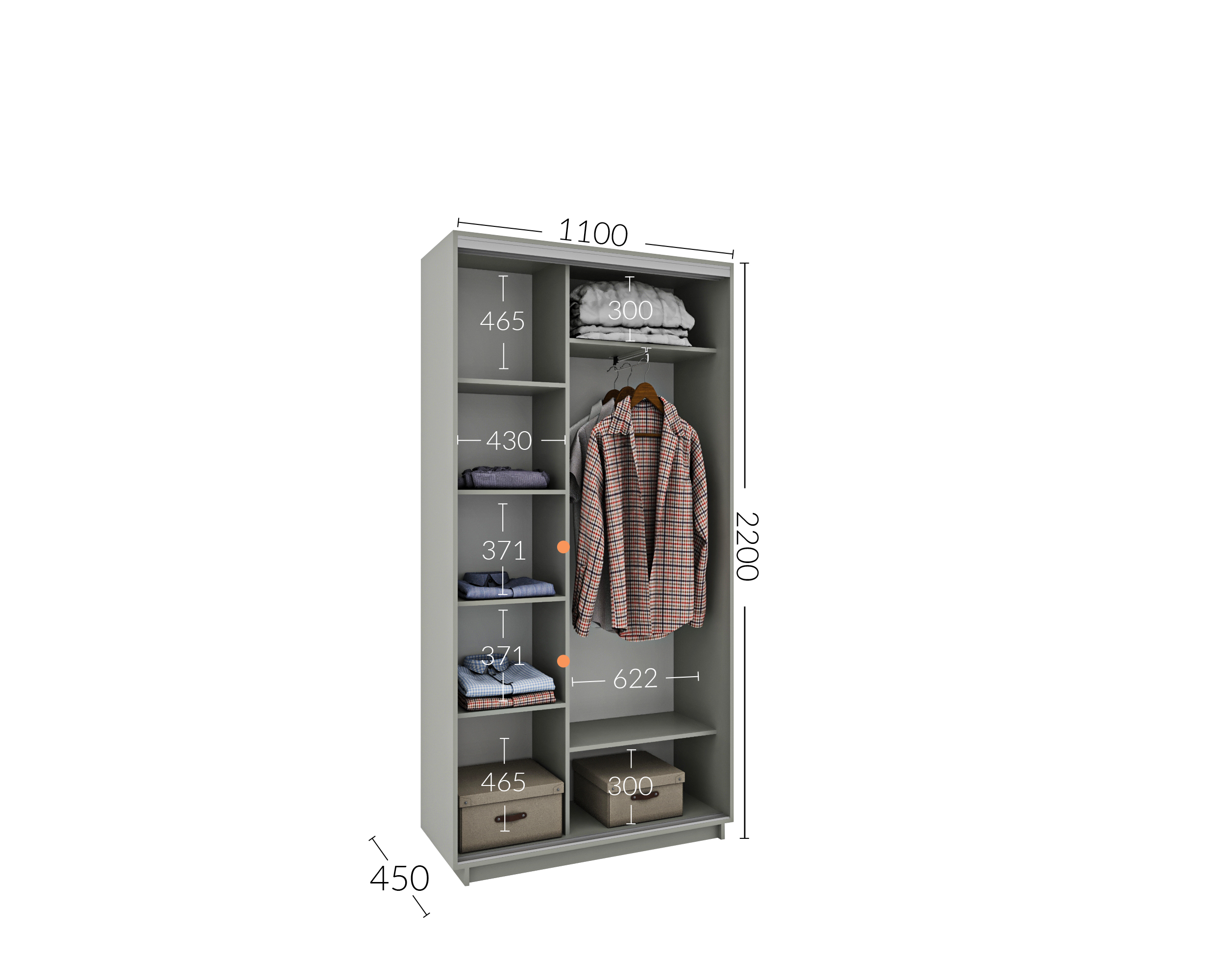 Шафа на замовлення розміром 1100 мм – це ідеальне рішення для компактних приміщень або для створення стильного акценту в інтер’єрі. Шафа має висоту 2200 мм і глибину 450 мм або 600 мм, що дозволяє зручно зберігати речі, зберігаючи при цьому простір. Ви можете вибрати фасади з дзеркальним покриттям або з фотодруком, що дозволяє створити унікальний дизайн відповідно до вашого смаку. Така шафа не тільки функціональна, але й стане елегантним доповненням до будь-якого інтер’єру.