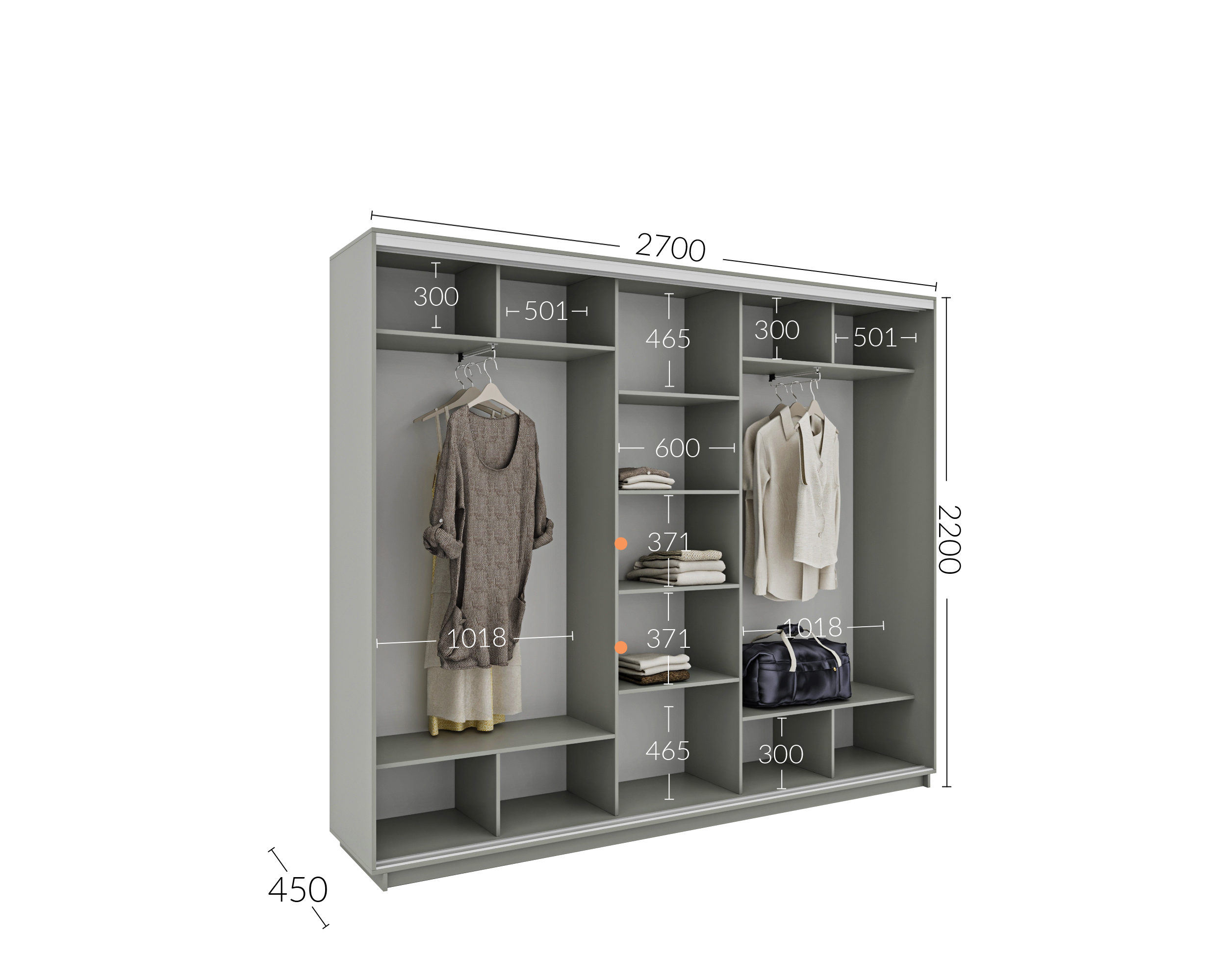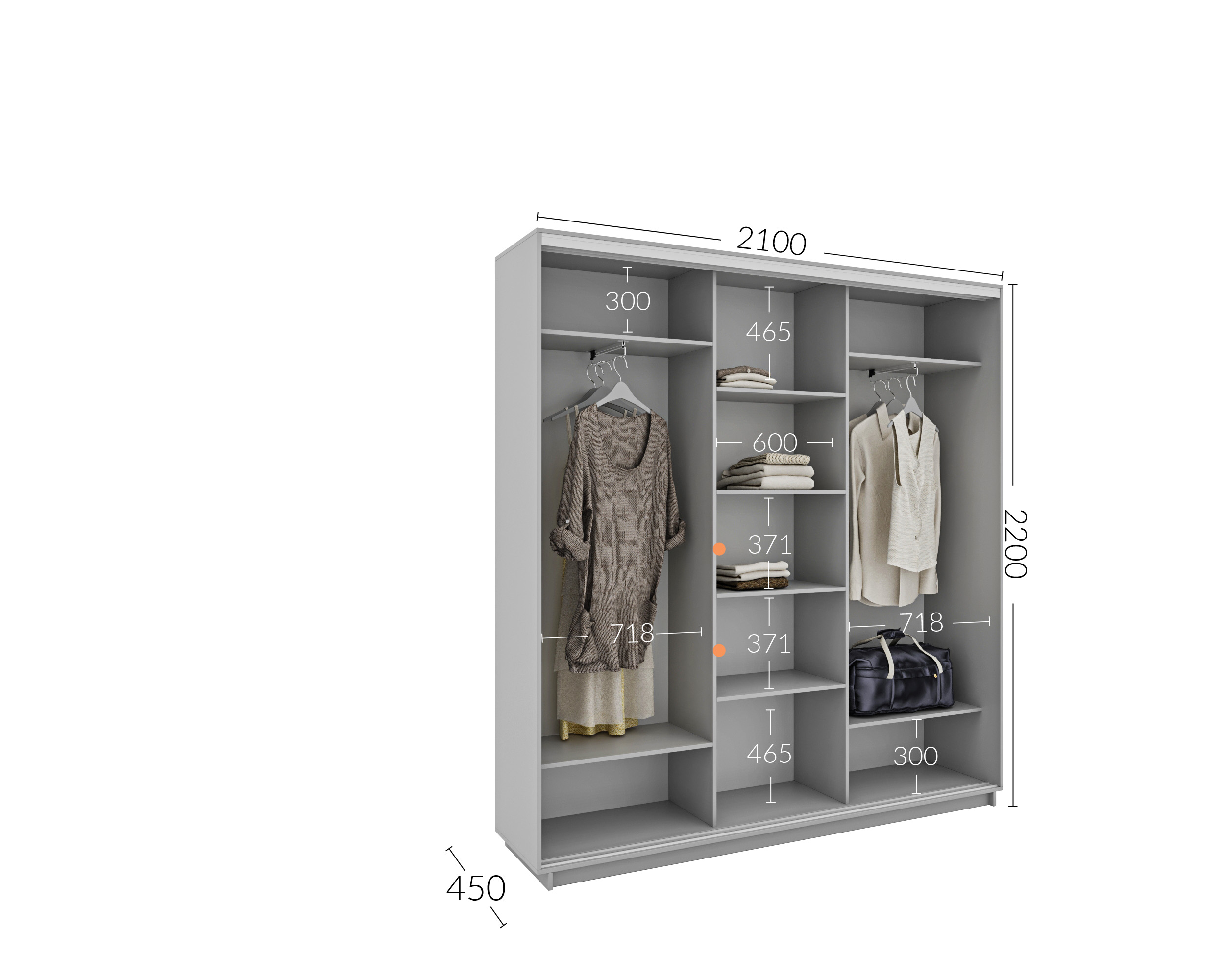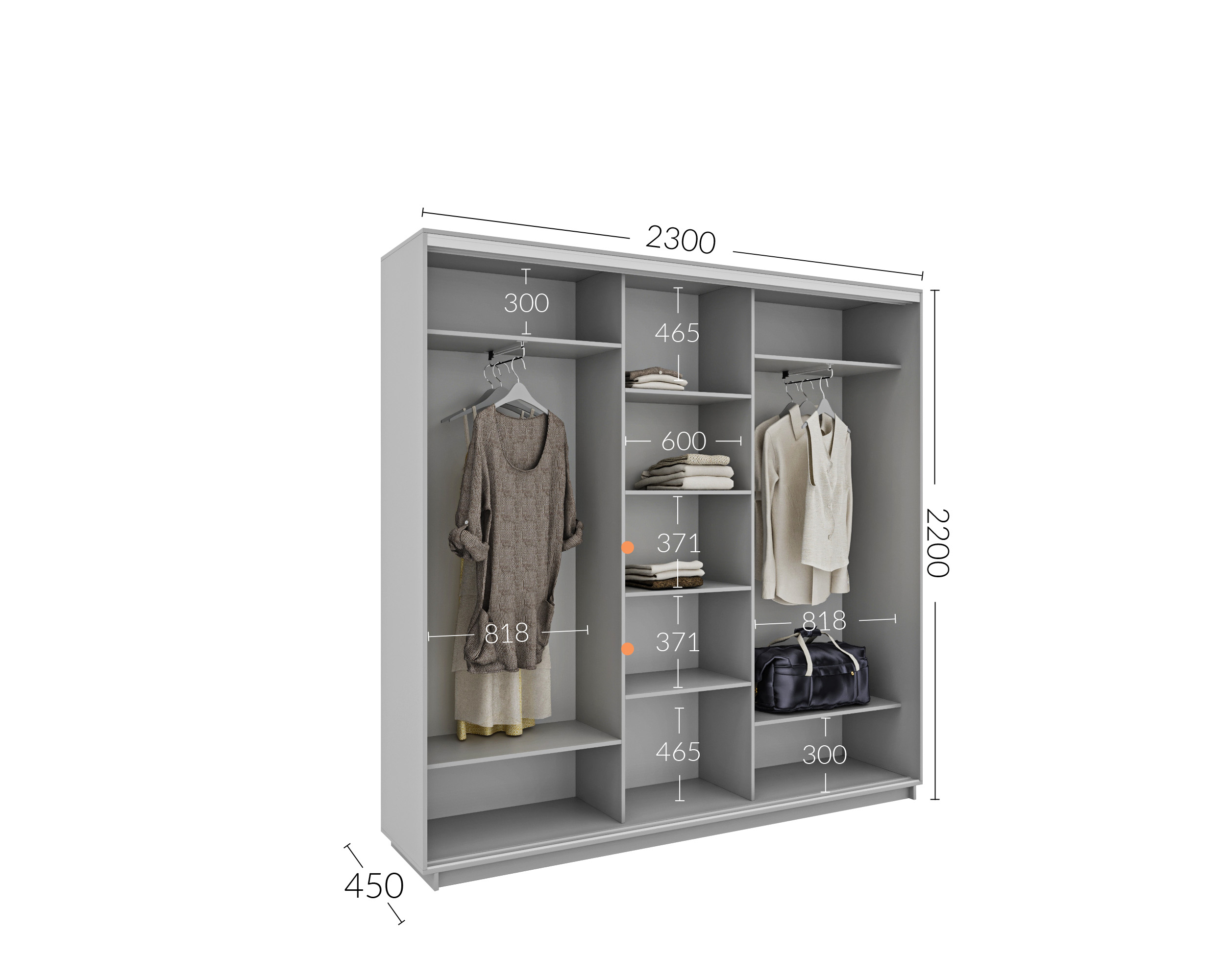 Тридверні шафи-купе на замовлення – це ідеальне рішення для тих, хто хоче оптимізувати простір та додати елегантності інтер’єру. Ширина шафи може бути змінена відповідно до ваших потреб, що дає можливість створити ідеальний варіант для будь-якого приміщення. Глибина шафи доступна в двох варіантах – 450 мм або 600 мм, що дозволяє вибрати оптимальне рішення залежно від ваших вимог до зберігання. Висота шафи складає 2200 мм, що забезпечує зручний доступ до всіх поличок та відділів. Це чудовий варіант для створення стильного та функціонального простору.
